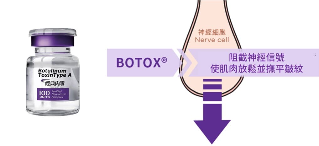 注射Botox後,肉毒桿菌素便會滲透至人體內的突觸前神經末梢細胞,裂解乙醯膽鹼釋放時所必需的突觸前目標蛋白SNAP25蛋白質,使乙醯膽鹼無法被釋放。