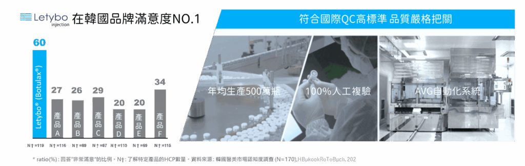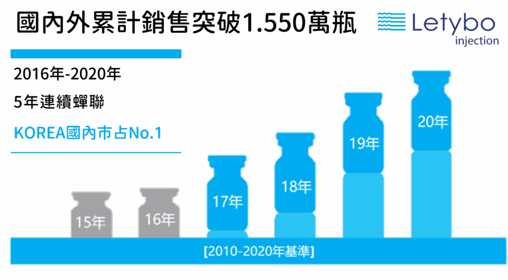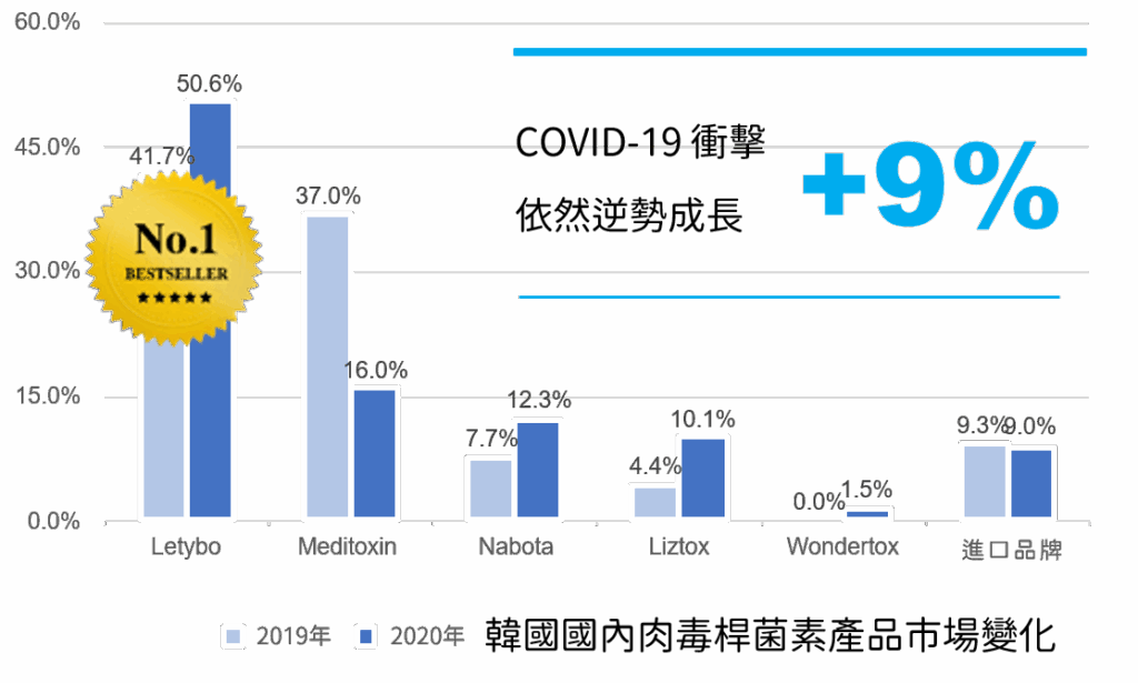 而在競爭白熱化的市場中,約有70%的肉毒市占率屬於國內本土品牌,其中又以保提拉肉毒表現最為亮眼。Botulax保提拉肉毒(台灣品名為Letybo)於2010年上市後,短短3年即爬升為韓國市佔率第一的肉毒產品,並連續多年蟬聯寶座、熱銷海外28國,也是日本市場使用最多的韓國肉毒品牌。