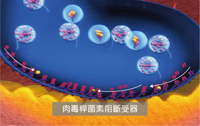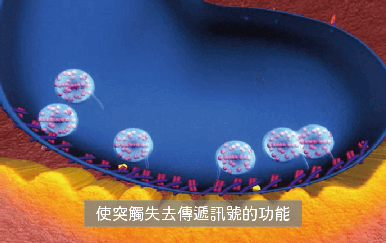 Step.2肉毒桿菌素進入突觸前神經末梢細胞,裂解乙醯膽鹼釋放時所必需的突觸前目標蛋白 SNAP25蛋白質,使乙醯膽鹼無法被釋放。