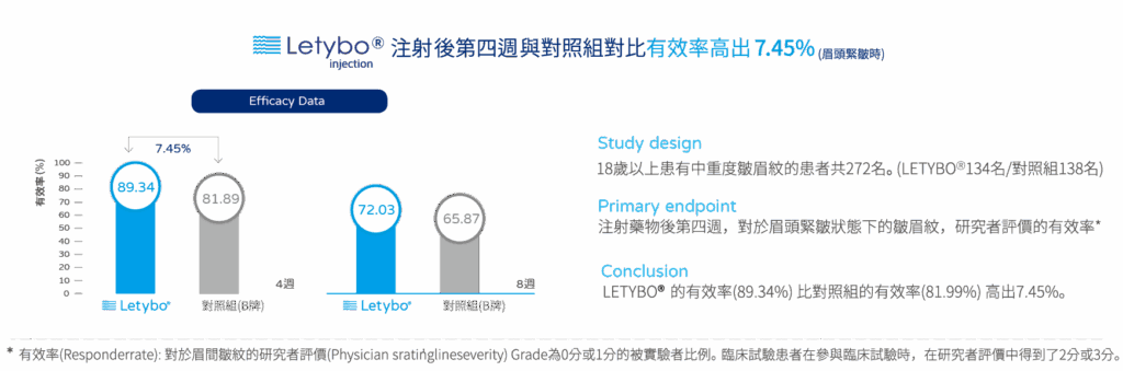 Letybo保提拉肉毒來台上市前,歷經近五年時間,經過三軍總醫院、林口長庚醫院、台北長庚醫院、國泰綜合醫院等多中心設計的第三期臨床實驗,以212名受試者以雙盲、隨機、活性的對照比較,證實有效改善二至三級之中度及重度皺眉紋,可做為美國肉毒品牌的替代品,提供台灣民眾CP值高的新選擇。