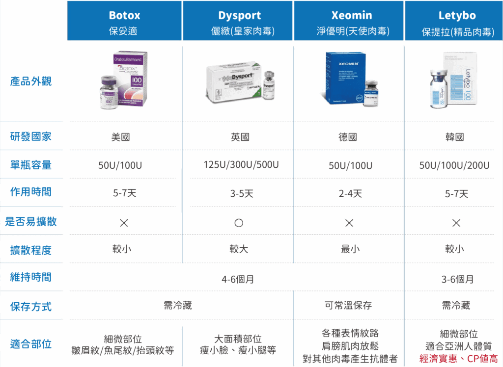 市面上常見的肉毒桿菌素A型可分為歐美肉毒與韓國肉毒兩種產品線,我們也將其各自特色分別表列整理: