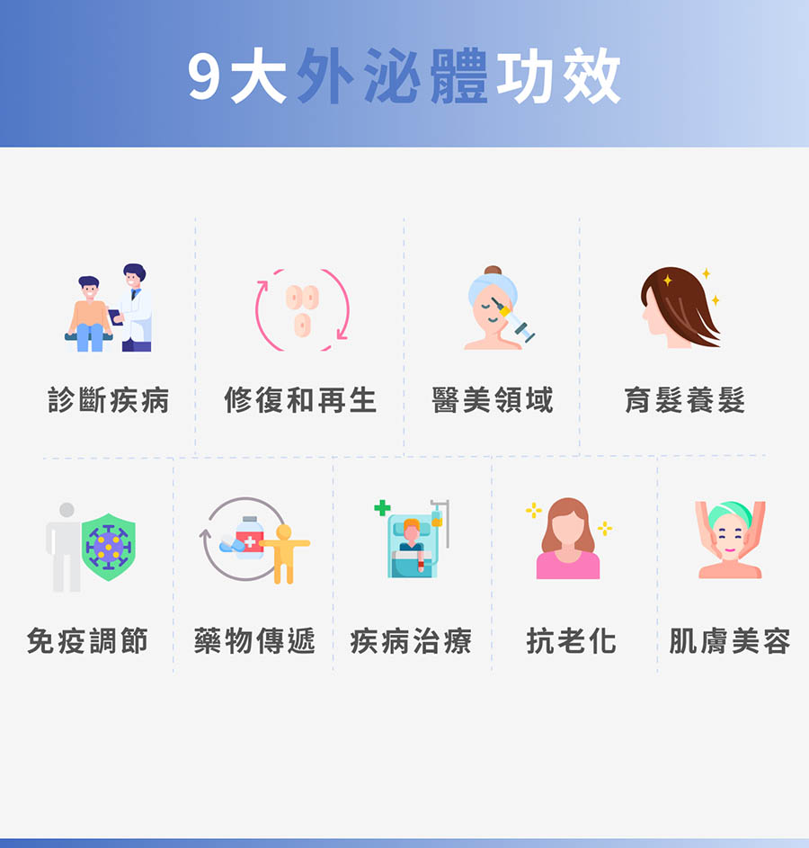 幹細胞分泌的外泌體不僅僅只是在細胞之間傳遞訊息,也對於許多身體機能發揮關鍵作用,從診斷疾病到促進皮膚再生,治療各類疾病到改進藥物傳遞,外泌體皆展現出無限的潛力。以下,我們將一一解說外泌體的9大功效及其在不同領域中的應用: