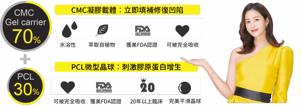 PCL 晶球 + CMC 凝膠 | 聚雙旋乳酸空心微球體 (Poly-D,L Lactic-Acid, PDLLA) + CMC 凝膠 | 聚左旋乳酸結晶體(Poly-L-lactic acid, PLLA) + CMC 凝膠 | CaHa 微晶球 + CMC 凝膠 | 聚雙旋乳酸晶球 ( PDLLA) + HA 凝膠 |