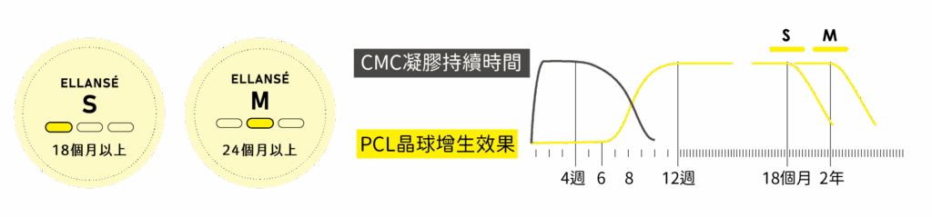 Ellansé 洢蓮絲原廠推出 S、M、L、E 共 4 種劑型,目前台灣衛福部核可的是 S 劑型與 M 劑型,兩者因膠體與晶球的鏈結程度不同,其維持的時間也有所差異。