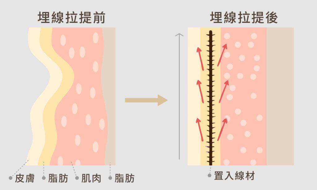 - 埋線拉提:透過皮下埋線支撐肌膚,並可同步刺激膠原蛋白增生的療程。