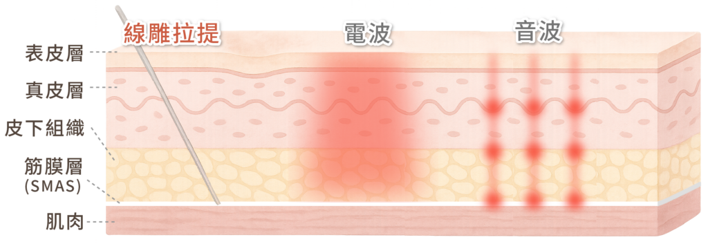 線雕屬立體式支撐拉提,效果立見,針對下垂改善較明顯;而音波/電波屬非侵入式刺激膠原蛋白,需多次療程累積效果。許多客人會選擇合併療程,提升整體緊實度與輪廓感。