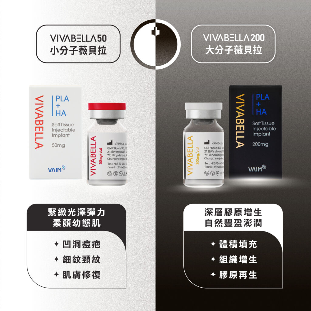 VIVABELLA 薇貝拉劑型分為以下兩種,又昵稱為「大分子薇貝拉(VIVABELLA 200)」與「小分子薇貝拉(VIVABELLA 50)」,兩者差異在於 PDLLA 微球的顆粒大小。不同分子的 PDLLA 微球體積,可適用施打在不同凹陷部位,也能解決不同老化困擾。