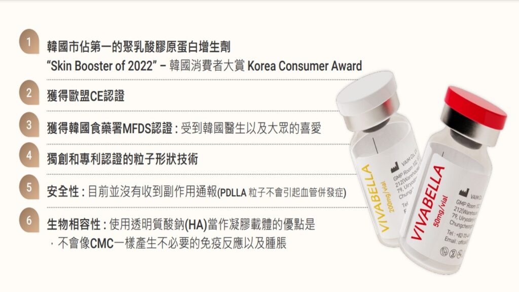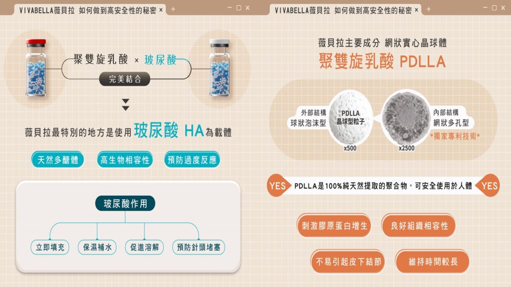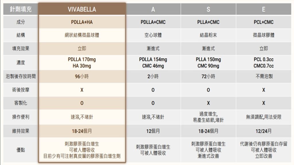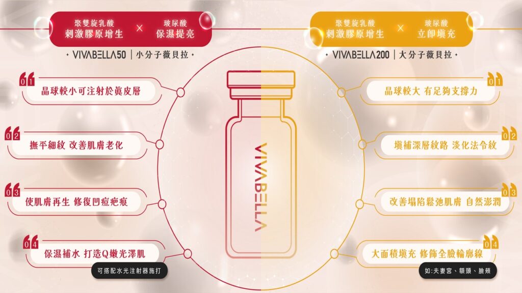 過往的膠原蛋白增生劑,主要都采單純的聚左旋乳酸,例如 4D 舒顏萃,或是聚雙旋乳酸,例如 AestheFill,主要以刺激膠原增生為主。而新一代的膠原增生劑 – VIVABELLA 薇貝拉,因為乘載玻尿酸,能達到即時填充的效果,並保有PDLLA聚雙旋乳酸長時間刺激膠原白生成的特性。