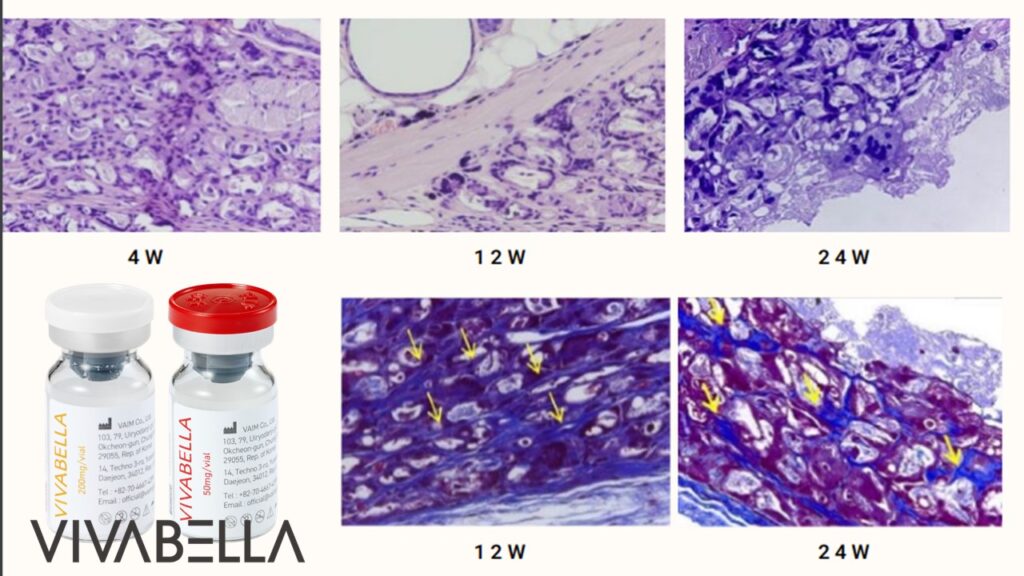 IVABELLA 薇貝拉注射於人體後,會以自然安全的方式持續漸進式刺激真皮層膠原蛋白增生,使皮膚呈現自然、柔軟、豐盈、彈潤,宛如天生的原生肌膚觸感。下圖可以看到注射後長達 24 周的增生效果。