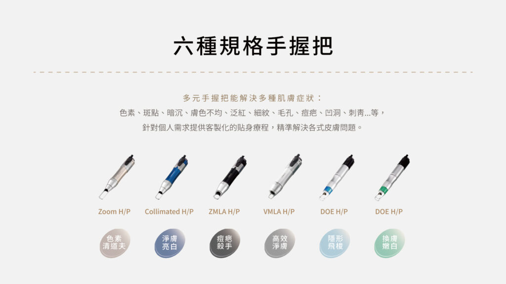 Picohi 300 擁有 6 種高規格手握把,搭載市面唯一的雙 MLA 聚焦透鏡(俗稱的蜂巢)與雙 DOE 光繞聚焦透鏡,具有高能量密度極穿透深度,除了針對黑色素分解之外,還可依照需求從表皮層到真皮層震盪出不同深度的空泡效應(LIOB),刺激膠原蛋白新生。透過聚焦探頭與皮秒探頭,提供量身訂製的療程選擇,進行專屬的皮秒雷射保養,治療上遠勝於傳統雷射。