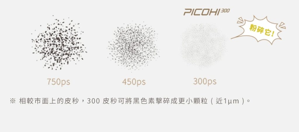 皮秒雷射的「皮秒」是一種時間單位,雷射擊發時間由一般傳統雷射的奈秒(nanosecond)縮短到皮秒(picosecond)單位,在短脈衝時間內產生強大的光震波,可迅速擊碎色素團塊成微細顆粒,再由人體代謝排出,這提升了色素清除效率,降低了對周圍組織的熱損傷。相較於其他皮秒雷射,300 皮秒雷射更不易刺激黑色素活化,大幅降低了反黑的風險。