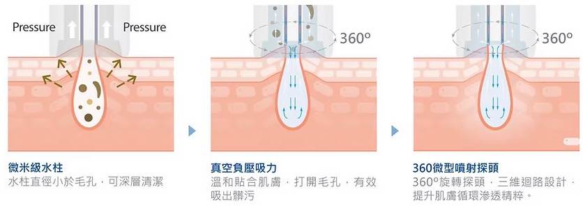 透過360渦旋流、微電腦精準溫控及負壓吸取,可以溫和地清除肌膚深層的空汙、殘妝、粉刺與老廢角質,並同時導入不同功能的精華液,達到深度清潔+營養注入的效果,讓肌膚重現自然光采!